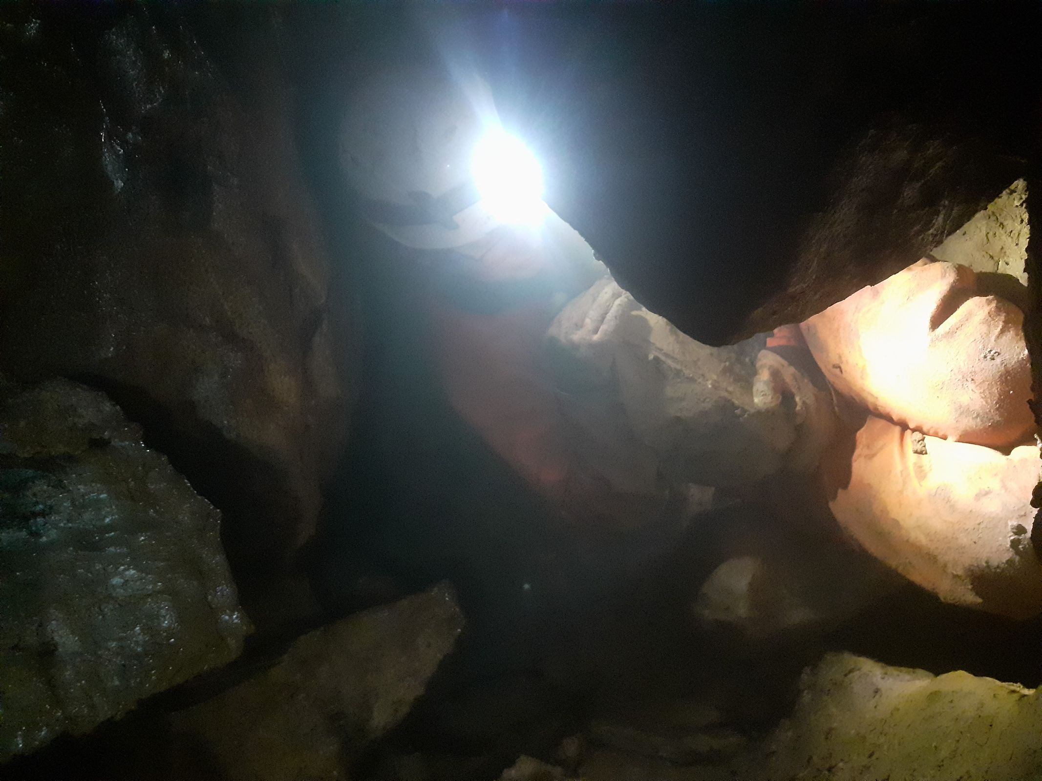 Решихме да продължим право напред и успяхме да разширим пролуката в дъното на заличката и да попаднем в пролазване към следваща блокажна ниша – право напред (2.5м дължина). Там под един масивен скален къс, с глинен под е следващото ни място. Вляво нагоре и надолу продължава, но трябва да се копае. Осезаемо се засилва духането, в посока нагоре през блокажа.