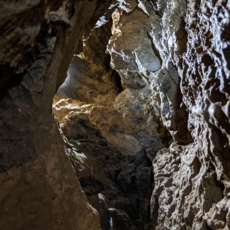 Основното предизвикателство беше една 3.5м висока глинена вертикална стена – възходящ праг, който се наложи да преодолеем. Стъпките бяха издълбани в самата глина и се наложи Светльо да ги доизкопае стабилно, но с взаимопомощ успяхме всички да се напъхаме в меандърчето над глинената стена. То бе пълно с хеликтити и красиви, но остри образувания. Продължихме да картираме.