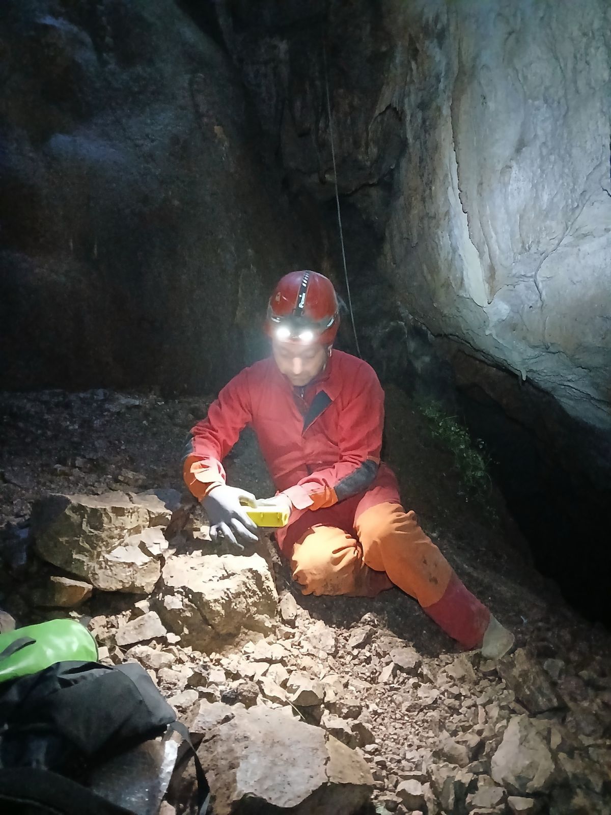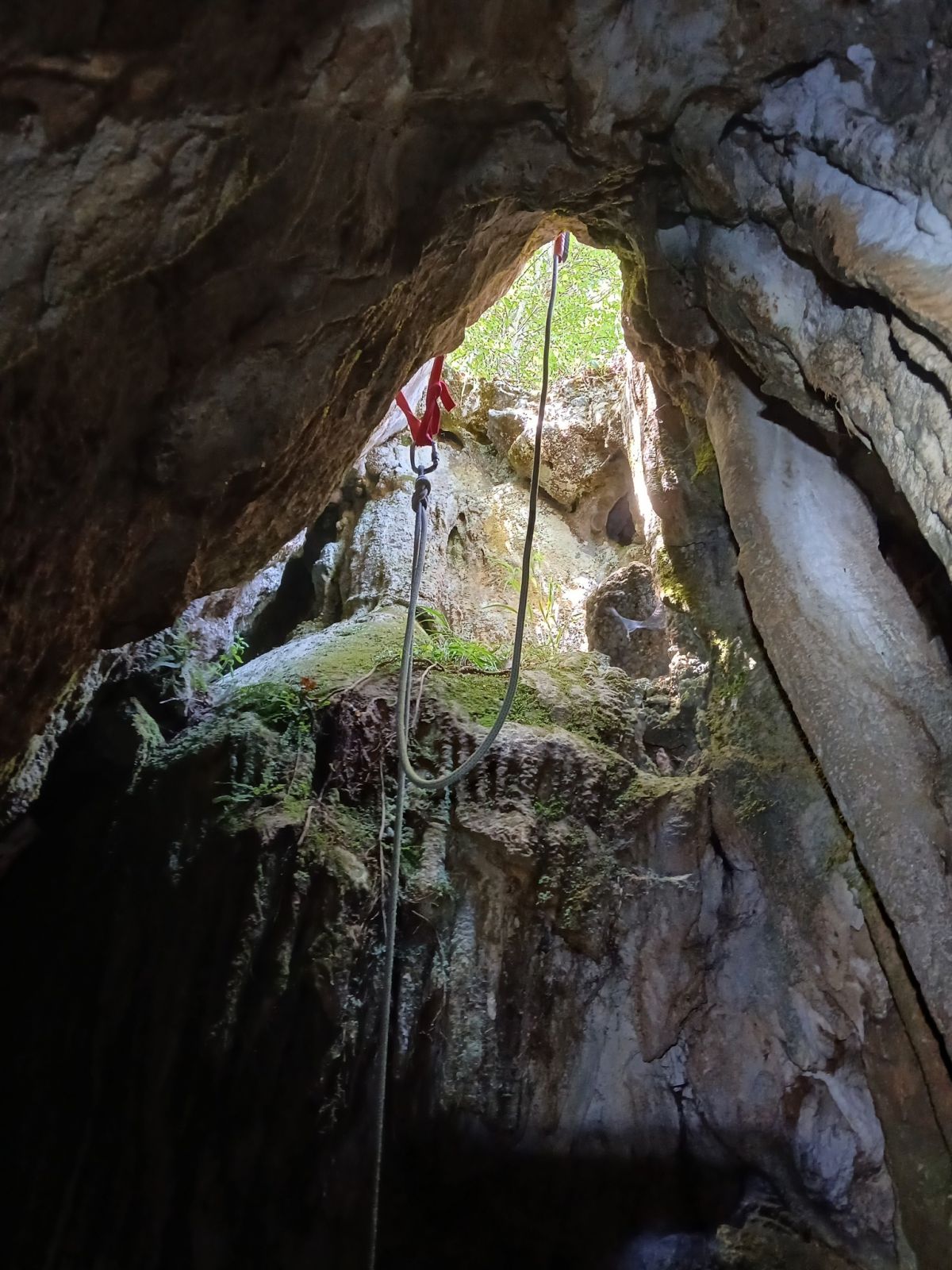 Жоро се облече и екипира перфектно иначе кривият за връзване входен отвес. През това време аз тествах инструментите за картиране и бяхме готови да се забавляваме. Взехме GPS точка и привързахме началото на картировката към нея. Разпределихме се, Жоро да работи с рулетката, а аз с таблета. Набързо картирахме входа и аз се спуснах на междинната площадка, където се осигурих на едни скални халки и освободих въжето на Жоро. Така той закачен на въжето можеше да взима данни, а аз също вързан в близост да приемам данните и да чертая на място.